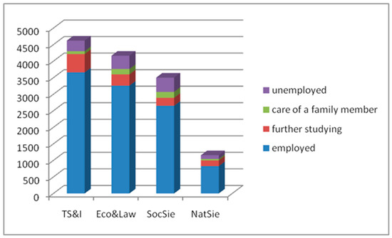 The data, collected as part of a national project, are available for the purpose of research activities for the project VEGA-1/0504/21. The database contains answers by 13,684 respondents, who are university graduates of various bachelor’s- and master’s-degree programmes and completed their studies between 2008 and 2014. Among these respondents, 236 were omitted from the research, as the vast majority of the key questions were not answered. Most of the 13,448 respondents (77%) were employed, with only 10% continuing their studies, 9% unemployed, and 4% staying home to take care of a family member. We divided the respondents into four groups by their field of study: 4622 respondents (34%) graduated from programmes in the technical sciences, including informatics (TS&I); 4166 (31%) were in economics or law (Eco&Law), 3504 (26%) in other social sciences (SocScie), and 1156 (9%) in the natural sciences (NatScie). Figure 1 illustrates the distributionof respondents according to their field of study and employment.