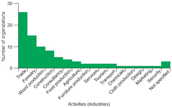 A total of 16 types of activities (industries) are established for the considered firms, which is evidence of their heterogeneity (Figure 3). The most common are trade, forestry, wood production, and construction. Apparently, a little more than half of the activities and the relevant firms are not linked to the usage of Siberian cedar. This is also true for the most common industries indicated above. The distribution of the firms by the industries in the Siberian and non-Siberian regions differs. In the Siberian regions, the main activities of the considered firms are trade, forestry, and wood production. Many of them can be related to the usage of cedar. In the non-Siberian regions, the main activities are trade and construction, and the relevant firms cannot be linked to the usage of cedar. Nonetheless, the industries and the firms unrelated to the usage of cedar are rather numerous in both Siberian and non-Siberian regions.