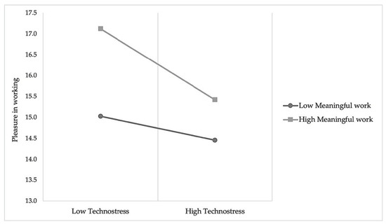 In conditions of high technostress, teachers with lower meaningful work perceptions experience significantly lower values of pleasure in working compared to teachers with higher levels of meaningful work perceptions. The perceptions of the meaningfulness of the teaching job have a significant role also in conditions of low technostress since low meaningful work is related to significantly lower values of pleasure in working.