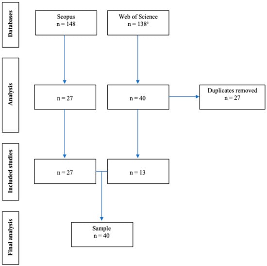 This systematic review followed a qualitative analysis that considered a set of criteria allowing us to extract data that corresponded to our objective. We used Scopus and Web of Science databases to examine the literature. The research focused between 2017 and 2021. We selected our data from the year 2017 because the literature considers that the phenomenon of contemporary fake news arose during the 2016 US elections. We did not include the year 2016 in the data search in order to filter contemporary fake news. Literature published before and even in 2016 associates the phenomenon of fake news with political satire (; ; . Previously, fake news was part of entertainment television programs (). Studies that focused on defining the new phenomenon began to emerge post-2016 (see ; ; ). We searched for publications that included the term “fake news” related to “political ideology”, “partisanship”, “left-wing”, “right-wing”, “liberal”, and “conservative” in the article titles, abstracts, and keywords. The focus of our research was on articles written in English, limited to a selection of those that had the United States or the European continent as their subject. We searched the literature in the Web of Science database and double-checked with Scopus database. Regarding the Web of Science database, we found that many articles have already been included in our Scopus selection. Our final sample consists of 40 articles (Figure 1).