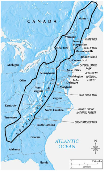 The geology of the Appalachians dates back more than 480 million years (Blakey 2008; USGS 2022a, 2022b, 2022c). Their origin resulted from the construction of the supercontinent Pangaea, with the Appalachians and Anti-Atlas mountains (now located in Morocco) being formed near the center of this ancient land mass. The Appalachian mountain range likely once reached elevations similar to those of the Alps and the Rocky Mountains before being eroded during the following millennia (Blakey 2008; USGS 2022a, 2022b, 2021). Figure One below depicts the Appalachian Mountain Range.