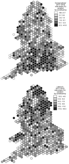 Labour’s and Conservatives’ vote share variations between the 2017 and 2019 general elections, by England and Wales’ constituency (equal classes): normalised geography maps by equal-area hexagons. Maps created by the author. Source: data from the UK House of Commons Library: https://commonslibrary.parliament.uk/constituency-data-election-results/, accessed on 12 July 2020.