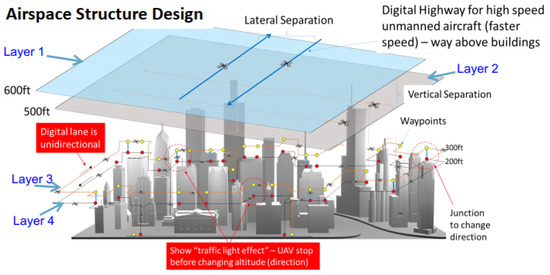 Another framework for managing drones in urban airspace called AirMatrix was proposed by Low Kin Huat (Low 2017). This approach is based on a multi-layered altitude and airblocks in latitude and longitude. Figure 4 shows a possible framework for managing drones in a city, including four layers classified by altitude. The first and second layers are above buildings, which are used for high-speed drones operating at heights of 600 ft and 500 ft. The third and fourth layers are used for drone applications in city airspace, which are 300 ft and 200 ft altitudes, respectively. When drones fly at low altitudes, they will follow selected waypoints, in which drones can change the height to change direction. This framework can allow: (i) UTM operators to study and design different airspace structures; (ii) the extraction of essential geometric data for analytical studies; the simulation of the traffic of drone operations; and the analysis of airspace performance, such as capacity, efficiency, and safety.