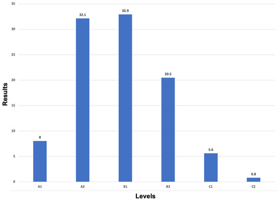For the average results per level of the DigCompEdu benchmark, there was a preponderance of level B1—Integrator (32.9%), in line with the overall average results of the study (with 38 points out of a possible 84 corresponding to B1). However, 32.1% of the respondents were at the second lowest level A2—Explorer, indicating greater weakness in the pedagogical use of technologies and digital resources (Figure 1).