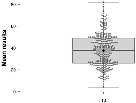 As can be seen in Figure 2, there was a greater proportion of intermediate values, with the answers inside the box (corresponding to 50% of the results) being between 26 and 49 points (out of a maximum of 84 points).