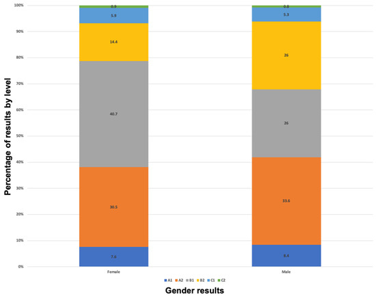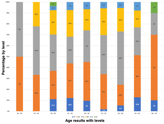 Figure 6 shows the percentage of respondents at each level according to age. There was a relationship between the results for respondents in this study and those of Spanish teachers, since, when we look at Figure 6, it can be seen that there were many more A2 levels in the group of older teachers (38.5% and 60%), and A1 levels (12.8% and 10%), than in the other age groups.