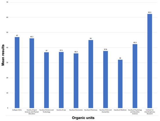 Another factor that is interesting to examine is the organic unit to which teachers belong, since the place where they carry out their functions is directly related to their area of academic and professional training. Observing the results in Figure 7, we find two that stand out positively, the College of Arts and the Institute for Interdisciplinary Research. These results can be explained by two factors, which do not influence the general analysis: the two units have very few sections and, on the one hand, specialise in doctoral studies (they do not have their own teaching staff); on the other hand, some of these participants were career researchers that teach on doctoral courses (75% of the respondents only teach master’s and doctoral level courses) and which use teaching-learning methodologies which are more adapted to the use of digital strategies. These characteristics are not typical of most teaching practice.