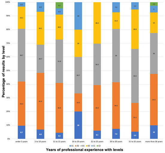 However, when we observe the average levels of results by length of service (Figure 9), it is precisely the group with between 16 and 20 years of service in which the highest percentage of teachers with an overall result at level A1 occur (20%), even though, added to the results at level A2, this represents a lower percentage than that of almost all the other groups, with the exception of the group of teachers with between 31 and 35 years of experience.