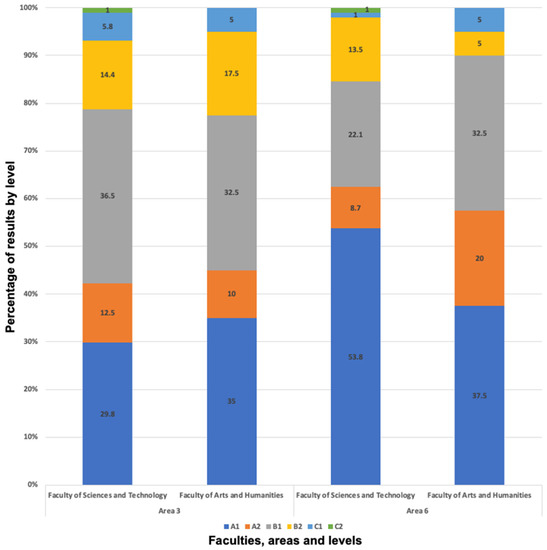 Based on the results, the Faculty of Science and Technology had many more training needs in Area 6, where the lowest levels (A1 and A2) represented 62.5% of the results, than in Area 3. The same situation was also observed for the Faculty of Arts and Humanities.