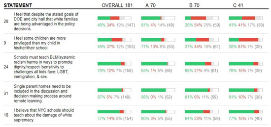 Pol.is uses a crowd sourcing mechanism and algorithm https://compdemocracy.org/algorithms/ (accessed on 8 May 2020) to find “opinion groups” and to surface what each opinion group has in common according to meta-statements. Our survey findings identified three opinion groups: Group A were those who were most concerned about racial inequality and its messaging in school; this group reported the most financial hardship (63%). Group B were those most in favor of in-person learning and schools remaining open; this group consisted of families with the youngest children. Within Group B, 92% agreed with the statement “Early learners need in-person school to learn to read and develop vital social skills. Remote learning is not developmentally appropriate”. Group C were most in favor of on-line learning (75% reported that remote learning should be a future option post COVID-19). This group consisted of families with children of mixed ages who attended more varied school types (but public school still predominated). Figure 1 below visually represents how Pol.is reports out survey findings, in this case illustrating how the three opinion groups responded to five different statements.