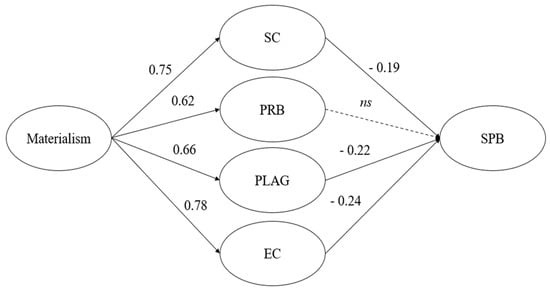 Hence, the nomological validity of the developed HB scale was assessed by testing its association with two relevant scales of materialism and SPB. Materialism was measured using a 9-item short version of the () scale as proposed and tested by (). The scale measuring SPB (4 items) was taken from (). For the purpose of the nomological validation, a sample of 273 respondents was collected. It was expected that materialism would be positively related with the HB scale, while HB would be negatively related with SPB. A structural equation model was assessed with AMOS and delivered an acceptable fit: χ2 (316) = 656.99; χ2/df = 2.08; GFI = 0.84; AGFI = 0.81; RMSEA = 0.06; SRMR = 0.05; NFI = 0.89; TLI = 0.93; CFI = 0.94; PNFI = 0.80. The results revealed that materialism positively affected all HB dimensions, which in turn had a negative impact on the SPB scale, except for the PRB dimension, which showed a non-significant relation with SPB (Figure 2). Therefore, the nomological validity of the scale was established.