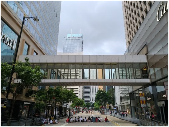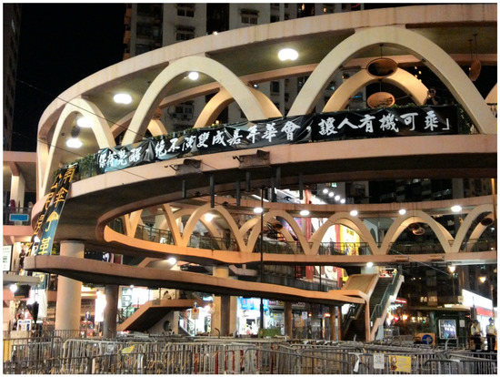 As an atypical and twisted public space controlled by the state, footbridges have rearticulated and reset the meaning of public space in social movements. As said in the introduction, the Anti-Extradition Law Amendment Bill Movement in Hong Kong in 2019 was an example. During the 2019 Anti-Extradition Law Amendment Bill Movement, there were some public places where public gatherings emerged (either legally or illegally) on the streets of Hong Kong, from street parades or customary gatherings in landmarks such as Edinburgh Place and Victoria Park to traditional political rallies like the 1 July Rally (Purbrick 2019, 2020). However, the function of footbridges is not limited to connecting different sites and buildings. During the social movement in 2019, the meaning of the footbridge was recreated (Hou 2020). The social meaning of footbridges seems to be separated from commerciality in social movements, and there was the possibility of returning the power of discourse to the public. Various community groups held small screenings on some large footbridge networks during the social movement in 2019 (Hou 2020). These footbridge networks are generally crowded and located in busy central business districts and downtowns. This phenomenon made the footbridge—as a fluid space—not only a medium for distributing information but also a space where citizens could stop and communicate with each other.