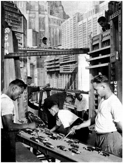 The narrative by Castells (1978) is also a reference to the outlines of urban space presented in the 1927 science fiction film Metropolis by Fritz Lang. The movie presents an imaginary image of the city of the future, with one set depicting a modern metropolis crisscrossed by towering mansions and bridges over elevated skies. Mechanical factories, indifferent and standardised cities, and vertical and geometric compositional buildings form the social order (Figure 3). This vintage film depicts the imagination of the modern city, reflecting the fear of future urban space at that time.