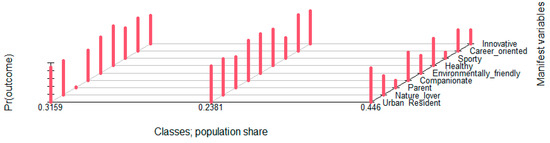 Based on the above, our latent variable has three unordered categories: Active (Class 1), Family Oriented (Class 2), and Typical Urban (Class 3). The distribution of the sample’s population in the three Classes is shown in Figure 1, where taller bars indicate a higher conditional probability of an individual who agrees with a self-identity item to belong to each Class. Therefore, 31.59% (N = 160) of the survey participants may be characterized as Active (Class 1), while 23.81% (N = 120) of them are Family-Oriented (Class 2), and the other 44.6% (N = 226) are Typical Urban (Class 3).