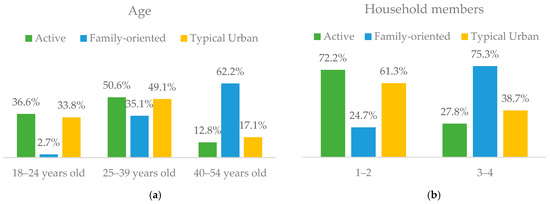 Figure 2b depicts the statistically significant association (χ(1) = 58.972, p-value < 0.001) we found between household size and the latent class variable. As expected, a Family-Oriented individual is more likely to live in a household with 3–4 people (75.3%), while an Active class member is more likely to live in a household with 1–2 people (72.2%). The Typical Urban population is comparatively more evenly distributed against the two studied household size categories.