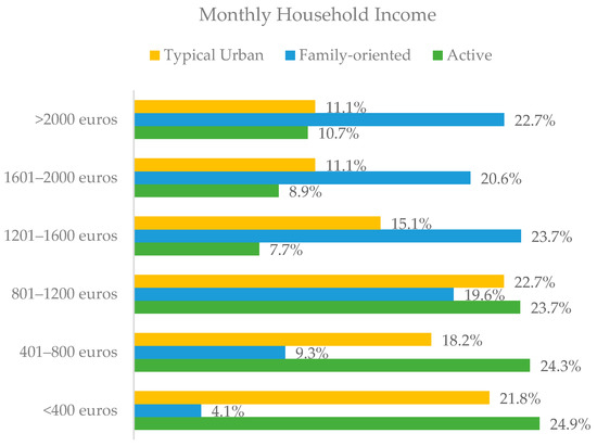 In the case of monthly household income, the chi-square test also demonstrated a statistically significant association with the latent variable (χ(1) = 49.502, p-value < 0.001). Figure 3 helps explain this result since it shows that the 67% of Family-Oriented members earn more than EUR 1201 per month in their households, while the 72.9% of Active members earn less than EUR 1201 correspondingly. The Typical Urban individuals represent considerable shares in all the income categories of Figure 3.