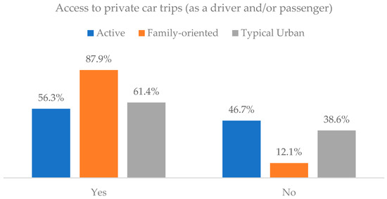 The chi-square test results indicated that the gross travel activity (number of trips per week by all modes) of the examined individuals is independent from their latent characteristics (χ(1) = 4.761, p-value = 0.783). However, the Family-Oriented group has comparatively greater access to private car trips (as drivers and/or passengers). This statistically important relationship (χ(1) = 4.761, p-value = 0.783) is illustrated in Figure 4.