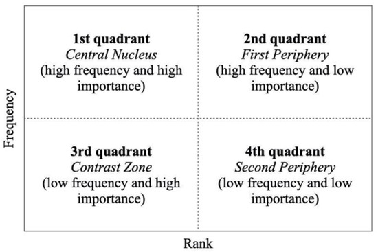 This analysis is aimed at identifying the elements that constitute the central nucleus and the peripheral system of SRs. All data were transcribed to a spreadsheet and then analyzed using the software EVOC 2000 (Scano et al. 2002), following Abric’s theory of the central nucleus (Dany et al. 2015) and Scano and colleagues (Scano et al. 2002) recommendations. The software EVOC 2000 provides a double-entrance table indicating the central nucleus and the peripheral system (see Figure 1) by crossing the frequency of the evocation of the elements and their elicitation order (i.e., their rank of apparition in the evocation). The core or central nucleus is constituted by elements with a high frequency (i.e., evoked by a large number of participants) and a low rank (i.e., elements appear first). A low rank usually represents topics and ideas of high importance, since they are first retrieved from memory (Abric 2005). The first periphery (second quadrant) is composed of the highly frequent but late-recalled elements, thus comprising less important ideas. These ideas strongly influence social practices and situational evaluations (Monaco and Lheureux 2007). The contrast zone (third quadrant) is composed of elements with a low frequency (i.e., evoked by a restricted number of people) and a low rank (high importance). As the name implies, this area is characterized by tensions between content and stability, suggesting possible changes in the SRs or a minor subtype of a different representation stemming from a social subgroup (Abric 2005). Finally, the second periphery (fourth quadrant) is constituted by less-often and late-evoked elements.