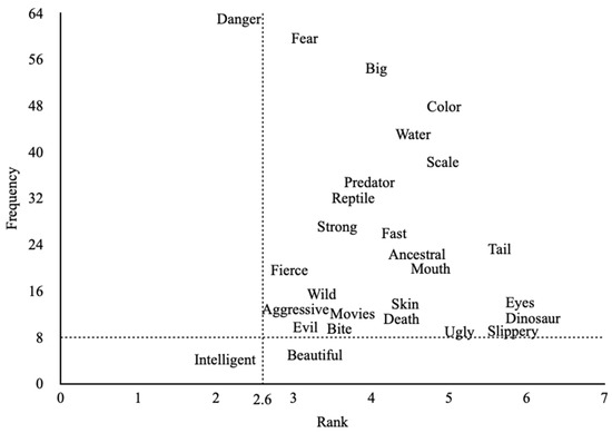 Scatterplot with words evoked for stimulus word “crocodile”. Cut-off points are represented by broken lines (rank = 2.6; frequency = 8). For a better read, the evoked word “teeth” is not represented due to its high frequency (114) (second quadrant).