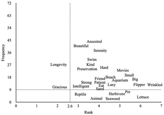 Scatterplot with words evoked for stimulus word “turtle”. Cut-off points are represented by broken lines. For a better read, the evoked words “shell”, “slow” and “sea” are not represented due to their high frequencies (116, 102 and 79, respectively) (second quadrant).
