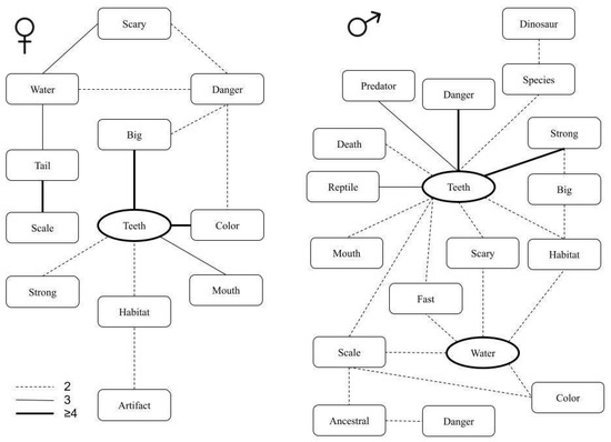 The female participants’ SR has a strong similarity to the general one. Teeth are also the core element from which most of the other ideas stem, although it is possible to observe a stronger set of nodes branching out from the main ideas. The first nodes describe the animal from a physical perspective (Mouth, Strong, Big and Color). The stronger associations (Big and Color) branch out to fearful emotions (Danger and Scary) but also to habitat (Water) and physical traits (Tail and Scales). Similarly, the male participants’ SR is similar to the female participants’ SR, but it goes deeper in detail. Instead of one central node, the male participants’ SR shows two central ideas (Teeth and Water), spawning a large number of first-node ideas. Threatening emotions (Danger, Death and Scary), alongside behavioral traits (Fast, Strong and Predator), are directly connected to, at least, one central node. The stronger associations come from each of these domains (Strong and Danger).