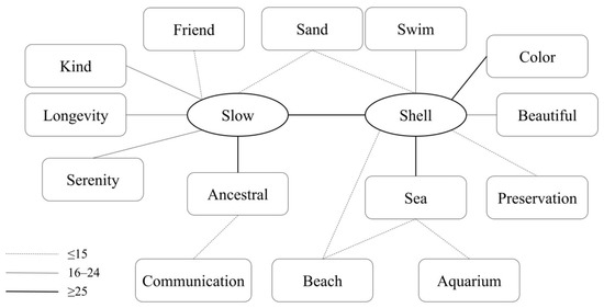 The SR of the turtle (see Figure 6) is structured around two direct and strongly interconnected main nodes: Slow and Shell. Slow branches out more strongly with Ancestral, which, in turn, connects to Communication. Positive emotions (Serenity) and positive “personality” traits (Kind and Friend) are also associated with this main node. The second main node (Shell) relates strongly to Color, and all other ideas stem from habitat (Beach, Sea and Sand), behavior (Swim), aesthetics (Beautiful) and, finally, conservation (Preservation). In sum, its SR is organized around ideas of positive or neutral emotions.
