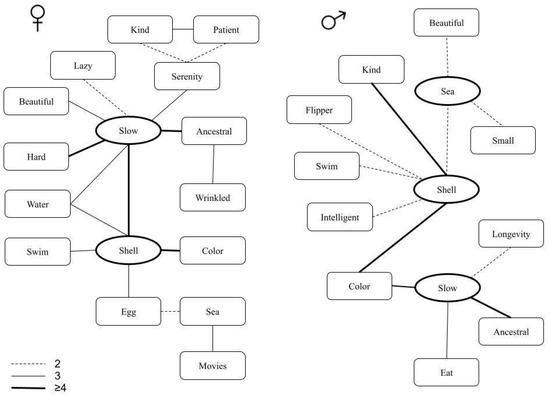 The female and male participants’ SRs of turtles are somewhat similar to the main one (Figure 7). The female participants’ SR draws on both central nodes (Slow and Shell) with similar ideas branching from them. Positive emotions (Serenity) branch further to “personality” traits (Kind and Patient), and Water is the common idea shared between the two central ideas. Reproduction (Egg) and Movies are now present. The male participants’ SR adds an extra main node (Sea) but, overall, is described in less detail. Similar aesthetics, behavior and “personality” traits are present.