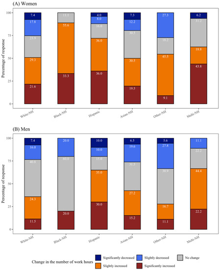 Changes in the number of work hours during the pandemic compared to pre-pandemic periods by race, stratified by gender: (A) women; (B) men.