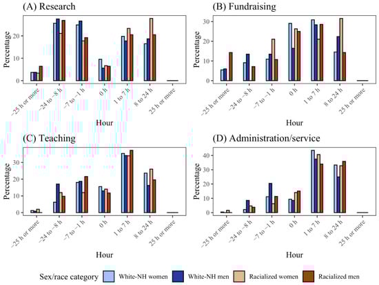 Of the total 1171 participants, 756 participants (64.6%) responded to the question regarding the changes in work hours by form of academic and scientific work, and the results are shown in Figure 2. For all categories (research, fundraising, teaching, and administrative/service), both men and women and all race/ethnicity subgroups included some persons who experienced increased work hours and some who experienced decreased work hours. In general, most people experienced more work hours for fundraising, teaching, and administrative/service tasks. The changes in work hours for research and fundraising were higher in racialized women compared to White women and men, although the difference was not statistically significant (Kruskal–Wallis χ2 = 5.6 and p-value = 0.130 for research; Kruskal–Wallis χ2 = 2.2 and p-value = 0.531 for fundraising). There were no significant differences in the changes in work hours for teaching among the gender and racial groups (Kruskal–Wallis χ2 = 5.4; p-value = 0.144). Of racialized women who responded to the question regarding teaching (N = 50), 60.0% of participants (N = 30) had increased work hours (≥1 h/week) for teaching, whereas the percentage of participants with increased work hours for teaching was 59.0% (N = 95), 50.0% (N = 29), and 56.9% (N = 62) for White women, White men, and racialized men, respectively. The percentage of participants with 8–24 increased work hours per week for teaching was 23.6% (N = 38) for White women and 26.0% (N = 13) for racialized women. The time for administration/service-related work generally increased across all groups (average 71.0%, N = 359), but the increased work hours were significantly lower for White men (Kruskal–Wallis χ2 = 10.5; p-value = 0.015); 62.5% (N = 95) of White men experienced increased work hours (≥1 h/week), whereas the percentage of participants with increased work hours was 76.9% (N = 180), 73.4% (N = 47), and 70.8% (N = 37) for White women, racialized women, and racialized men, respectively.