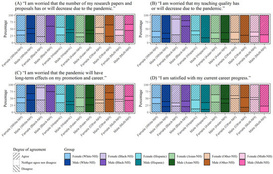 In statistical analysis, we used three outcome variables. The first variable was the changes in work hours measured with five ordinal categories. The second variable was the changes in work hours with seven categories of hours (e.g., −25 h or more, −24 to −8 h, −7 to −1 h, 0 h, 1 to 7 h, 8 to 24 h, and 25 h or more). The last variable was the degree of worry (i.e., agree, neither agree nor disagree, and disagree) for concerns related to research, teaching, and career development. The percentages of responses for categories of changes in work hours (i.e., significantly decreased, slightly decreased, no change, slightly increased, and significantly increased) by gender (female, male, other) and race/ethnicity were compared. We grouped gender by “other” for all categories other than male and female, given the small percentage of respondents in these categories (1.6%). The percentages of responses for seven categories of changed work hours were reported for total work and different types of work (research, fundraising, teaching, and administration/service). The percentages of responses for the degree of worry about COVID-19 impacting the number of research papers and proposals, teaching quality, and long-term career were compared by gender and race/ethnicity, as was the degree of satisfaction for current career progress by gender and race/ethnicity.