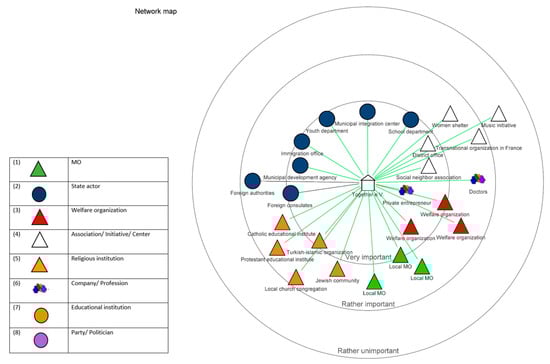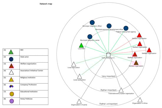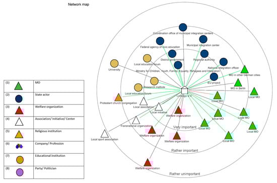 All network partners were divided into the following eight organizational types: (1) MO, (2) state actor, (3) welfare organization, (4) association/initiative/center, (5) religious institution, (6) company/profession, (7) educational institution, and (8) party/politician. The first type includes all MOs, organizations, and federations. Examples of this would be a local cultural club or an umbrella organization at the federal level. The state actor type includes all network partners at the state level, regardless of whether or not they are based in Germany or abroad (although the network partners mentioned were mainly in Germany or the respective country of origin), and comprises municipalities in general, municipal offices (e.g., youth welfare office), ministries, police and—particularly in North Rhine–Westphalia—municipal integration centers. The third type covers established welfare organizations, especially the large umbrella organizations such as Caritas, Diakonie, and Arbeiterwohlfahrt (Workers Welfare Organization). MOs are often members of the Deutscher Paritätischer Wohlfahrtsverband (German Parity Welfare Association) since it brings together many smaller organizations, institutions, and initiatives that represent a diverse and varied spectrum of social work.