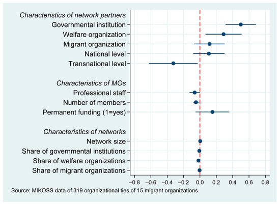 Figure 2 shows the coefficients of the multilevel regression model, with the characteristics of network partners and the MO as well as characteristics of the networks. The most relevant effects came from the characteristics of network partners. Effects were strongest when governmental institutions and network partners operated on a transnational basis; while the former are the most relevant network partners, the latter are the least relevant partner organizations. However, the characteristics of MOs and their networks are irrelevant when it comes to the importance of network partners because the effect sizes of all the characteristics are close to zero. The small database of 319 network partners of 15 MOs means that the confidence intervals were quite large, especially for dummy variables. Thus, the results are not robust.