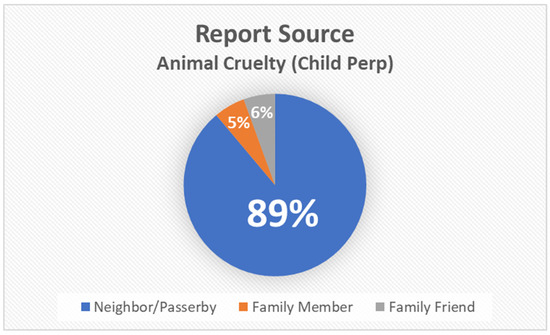 When a report source was indicated for cases of child-perpetrated animal cruelty, 89% of the time it was a neighbor or passerby who made the report (Figure 2). All cases of animal cruelty perpetrated by children involved abuse rather than neglect. Acts of abuse were most often inflicted to dogs (62%) or cats (23%). A total of 15% of reported child-perpetrated acts of animal abuse involved wild animals.