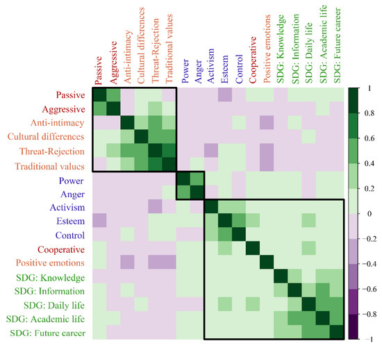 First, the pairwise relationships between SDG knowledge, opinion items, and latent dimensions were studied. A graphical representation of the correlation matrix is shown in Figure 1, where the variables are grouped according to the relationships between them using Ward’s hierarchical clustering. A green and purple colour scale highlights direct and inverse relationships between each pair of variables, respectively. In turn, the strength of the relationships is captured by the intensity of the colour. It is worth noting that the SDG knowledge and opinion items show direct relationships with the control, esteem, and activism dimensions of the Empowerment Scale, cooperative of the Conflictalk Scale, positive emotions of the Prejudice Scale, and inverse relationships with threat–rejection and traditional Values of the Prejudice Scale. Different colours are used to differentiate each scale: SDG opinion and knowledge (green), empowerment (indigo), Conflictalk (red), and Prejudice (orange).