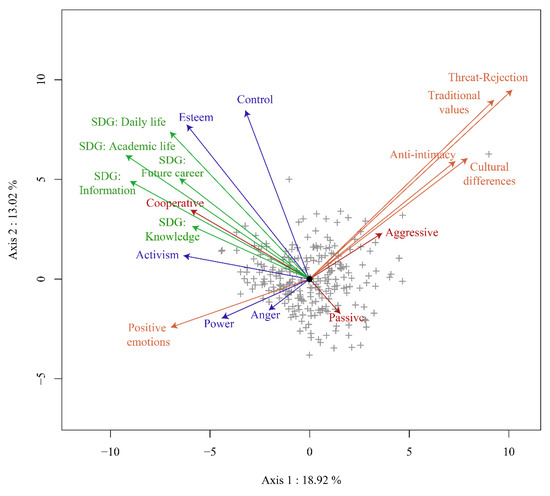 - Correlation between items and dimensions: The relationship between SDG knowledge, opinion items, and the three scales’ latent dimensions can be examined. It is necessary to study the angles that comprise the arrows representing them. Thus, items and/or dimensions presenting angles of <90° are variables with direct and strong relationships shown by how the small this angle is. This correlation implies that students with higher scores on one variable also have higher scores on the other. Conversely, angles >90° imply inverse relationships between these items/dimensions. The closer the corresponding angle is to 180°, the stronger the relationship. Thus, students with higher scores on one variable will have lower scores on the other. Finally, angles closer to 90° imply independence of variables.
