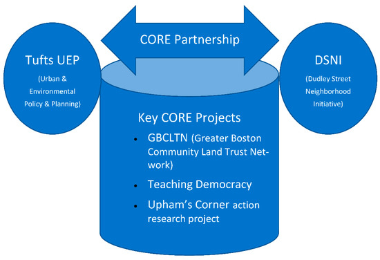 In this paper, we have described our experience in CORE, a multi-year CUP between Tufts UEP and DSNI. CORE was designed to address well-known shortcomings of CUPs, such as being too short-term, undervaluing community expertise and its role in co-production, and focusing on benefits to the university over the community. We found that shared governance and funding, formalized through a 3-year MOU, laid the next stage for deepening our partnership, which had already been decades in the making. CORE helped DSNI to advance not only its programmatic goals, such as building the GBCLTN and furthering community planning in Upham’s Corner, but also helped it to build its leadership and capacity. The cross flow of people from DSNI to Tufts and vice versa has helped to make the boundary between university and community more porous. More importantly, it brings people from both institutions into closer and deeper relations.