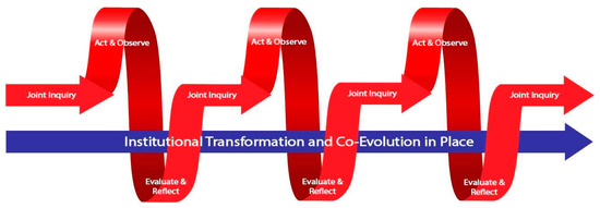Loh 2016). Starting with joint inquiry and planning, community and university stakeholders integrate teaching, research, and practice over a cycle of three to five years and, if sustained, co-evolve in place over decades (see