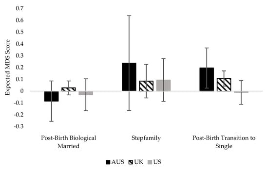 We urge the reader to examine the standardized regression coefficients, presented in parentheses below the unstandardized regression coefficients, in tandem with the hypothesis tests (Lash 2017). Using just null hypothesis significance testing, we found that no family structure in the US or AUS was related to MDS when other explanatory variables were included. However, the sample sizes in the US and AUS were smaller than that in the UK. If we examine the predicted values of MDS (Figure 1), we see smaller differences in terms of real-world effects than we might assume from the statistical significance tests reported above. In addition, perhaps because of a smaller sample size and commensurately smaller family structure groups in the Australian data, the confidence intervals for Australia were much larger than those for the UK and US data. While our sample sizes were still sufficiently large to consider statistical significance, we encourage readers to consider the significance in conjunction with effect sizes and note that we are most confident in the differences between post-birth single-parent families in the UK and the US. Data collected by the same organization that included all three countries might allow for multilevel models that can help adjudicate these questions in the future (see Limitations section below).