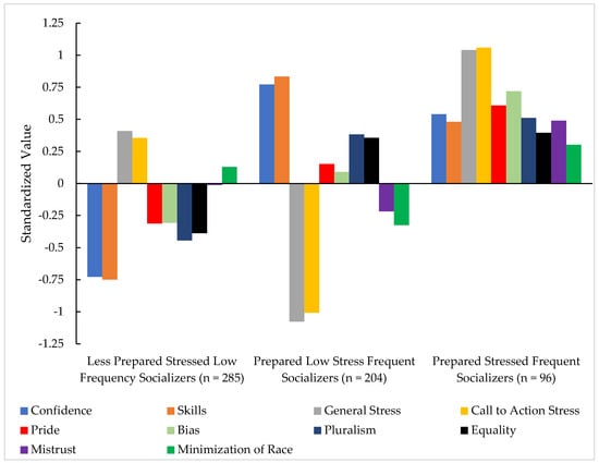 Parents in the smallest profile were termed Prepared Stressed Frequent (PSF) socializers. The 96 parents (16.41% of the sample) in the PSF profile were characterized by above average confidence and skills but the highest levels of general and call to action socialization-related stress. PSF parents administered the most frequent RES of all parents, regardless of the content of the socialization message types. PSF parents were, thus, highest in positive messages and negative messages such as promotion of mistrust and minimizing the importance of race. Unstandardized values by profile may be seen in Table S2.