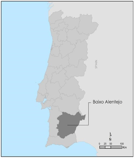 Baixo Alentejo, a Portuguese region and a part of the larger Alentejo region (NUTS II), is bordered to the north by the district of Évora, to the east by Spain, and to the south by the district of Faro. The NUTS III region consists of 13 municipalities: Aljustrel, Almodôvar, Alvito, Barrancos, Beja, Castro Verde, Cuba, Ferreira do Alentejo, Mértola, Moura, Ourique, Serpa, and Vidigueira (see Figure 4).