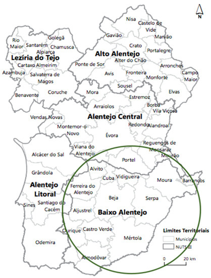 The current study, with its focus on the SI impacts in the development of rural regions, is built upon the data collected in the rural region of Baixo Alentejo in Portugal, with the specific focus on the Association for the Development of the Municipality of Moura (ADC Moura). In order to provide the background information, the current section introduces some data concerning the development of the correspondent NUTS III1 region (Figure 3).
