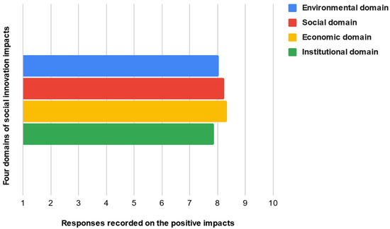 The impacts in the social domain, identified as any social change related to the living conditions, health and general well-being of the communities, and described through the social changes related to the change in communities’ conditions, including the creation and establishment of networks through SI projects, changes in attitudes, and re-configuration of (social) practices, have been registered with a relatively high average. For the social domain of SI impacts, the average among the responses is recorded at 8.24 (10-point scale), thus, confirming the perception of the social impacts in this domain as positive as well.