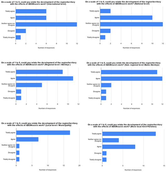 Concerning the question of ADC Moura’s work and its impacts within the spatial scale, the level of municipality of Moura (local level) is perceived as the territory that ADC Moura’s intervention affects the most, followed by the sub-regional level of Baixo Alentejo (NUTS III) and the regional level of Alentejo (NUTS II) (see Figure 7). The local geographical focus of impacts is reinforced as the main area of ADC Moura’s intervention, according to the association’s mission, is the development of the municipality of Moura.
