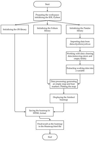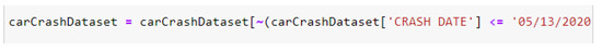 The set contains data since 2012. To make it relevant, we drew a heatmap for the whole year, that is, for the previous 12 months. One of the greatest advantages of the Pandas library is that it can read dates as strings. To process annual data, it is necessary to set a condition that the date in the CRASH DATE column is less than or equal to a specific value in the last year—for example, from 13 May 2020 to 13 May 2021 (Figure 7).