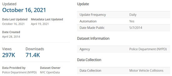 Available online: https://data.cityofnewyork.us/Public-Safety/Motor-Vehicle-Collisions-Crashes/h9gi-nx95, accessed on 21 May 2021.