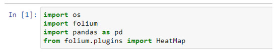 Next, the required Folium and Pandas libraries need to be initialized along with the OS system library. This will help save the final result as an .html file in order to view it without the need for an internet connection and independently of the project (Figure 4).