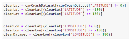 Once this is done, all fields have the correct values and can be further transformed. Subsequent testing revealed that the set contained incorrect width and longitude data. The width and longitude vary between –180 and 180 degrees and must be non-zero. The corrections need to be made by excluding such data. Firstly, the zero values are deleted, followed by those beyond the range of –180 to 180 (Figure 6).