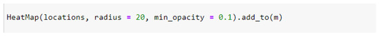 Step 7 involves uploading the ready-to-use data onto the map and applying the preset locations variable, followed by specifying values for the radius and min_opacity parameters. The radius and min_opacity are 20 and 0.1, respectively (McKinney 2017). Radius = 20 means that the point plotted on the map will be approximately 20 meters. Min_opacity refers to the arrangement of the colors in sequence from cold to hot, where 0.1 is the coldest (blue color). Max_opacity is calculated automatically. After all of the values have been loaded and processed, the data are plotted on the base layer generated above (Figure 10).