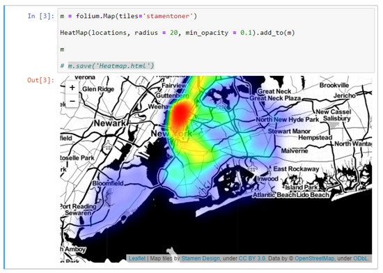 To put the heat overlay on, the map has to be initialized by utilizing the Folium library. In this paper, a stamentoner map was generated to produce a clean black-and-white image (Figure 9).