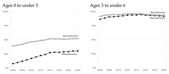In the international literature, Germany has commonly been classified as a conservative and familialistic welfare state that supports the single-earner model (Esping-Andersen 1999). The main policies that underpin this system are the option of joint taxation for married partners, the free coverage of the non-working spouse in the public health care system, and the tax exemption for marginal employment. Although these policies are still in place, family policies in Germany have undergone radical changes in recent years. In 2007, Germany introduced an earnings-related parental leave benefit, which was largely copied from the Swedish parental leave system (Leitner et al. 2008). Since 2005, the child care infrastructure in Germany has been significantly expanded. Unlike in countries such as the UK, which has a day care system that is mainly private, in Germany, child care is relatively inexpensive, and is mostly free of charge for low-income households. In 2013, a legal right to a public day care slot for all children aged one year or older was introduced, which further accelerated the already positive trend toward the use of public day care institutions. Figure 1 shows that only 8% of children under age three were in day care in 2006. By 2016, this share had risen sharply to 28%, which represents a 250% increase in a period of only 10 years. Partly as a legacy of the socialist era, child care has always been more widely available in eastern Germany (former German Democratic Republic) than in the western states of Germany. Against that background, the increase in child care usage has been less steep in eastern than in western Germany. For older preschool children (ages 3–5), the usage of public child care has become almost universal, and there have been no major changes in enrolment in the most recent years. However, many of the day care slots are used on a part-time basis only. While Germany has made tremendous advances in supporting the parents of children under age three, it offers less support to parents of older children. As many schools are still only part-time, parents often face considerable difficulties in arranging child care after their children enter primary school (Alt et al. 2019; Hüsken 2015).